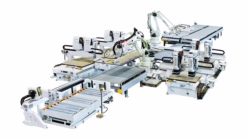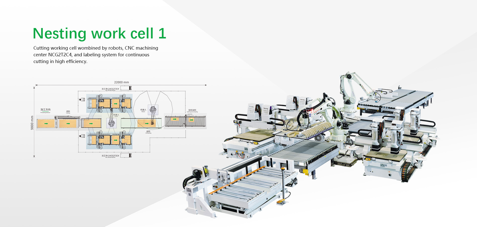 The cutting cell with 2 sets of NCG2T2C4 CNC machining center for cutting, 2 gantries,2+2 main spindles creating 2 working stations for multiple efficiency in panel processing, single machine can finish one sheet of standard 4’×8’ or 4’×9’ panel within 1.5 min. Utilization rate is 3% higher than computer panel saw. Tireless robots link with 2 sets of NCG2T2C4 perfectly to achieve complete intelligent automatic cutting process.