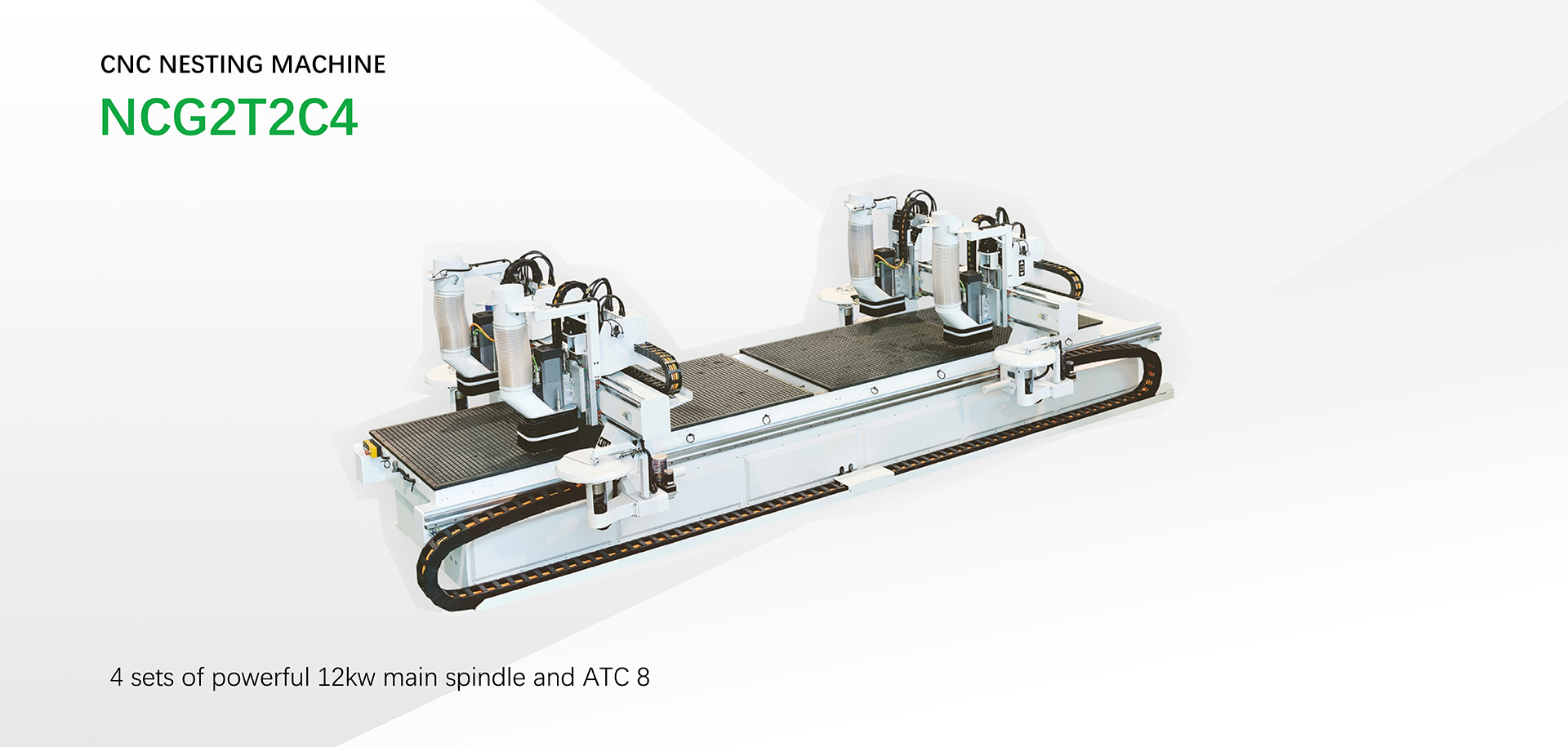 NCG2T2C4 is specially designed for cutting, flexible and high efficient for customized production due to 4 sets of powerful 12kw main spindle and ATC 8 working on two gantries and 2 working area, , this is ideal machine to combine with robots to build cutting working cell