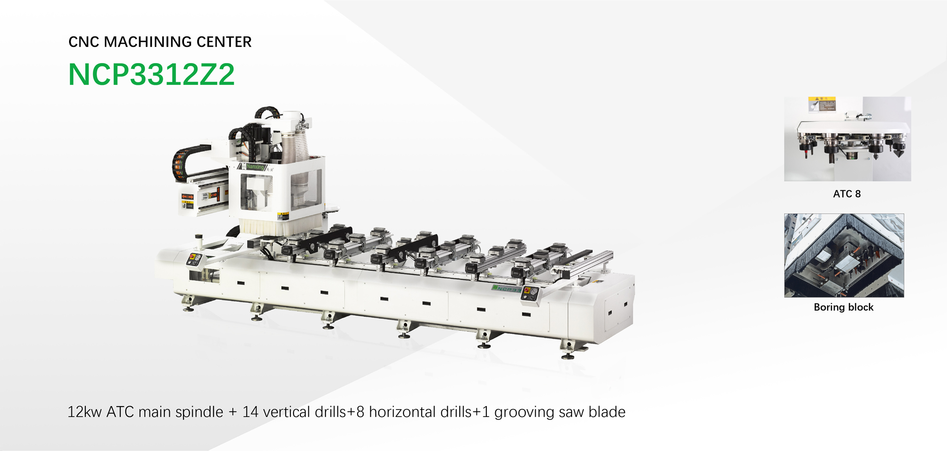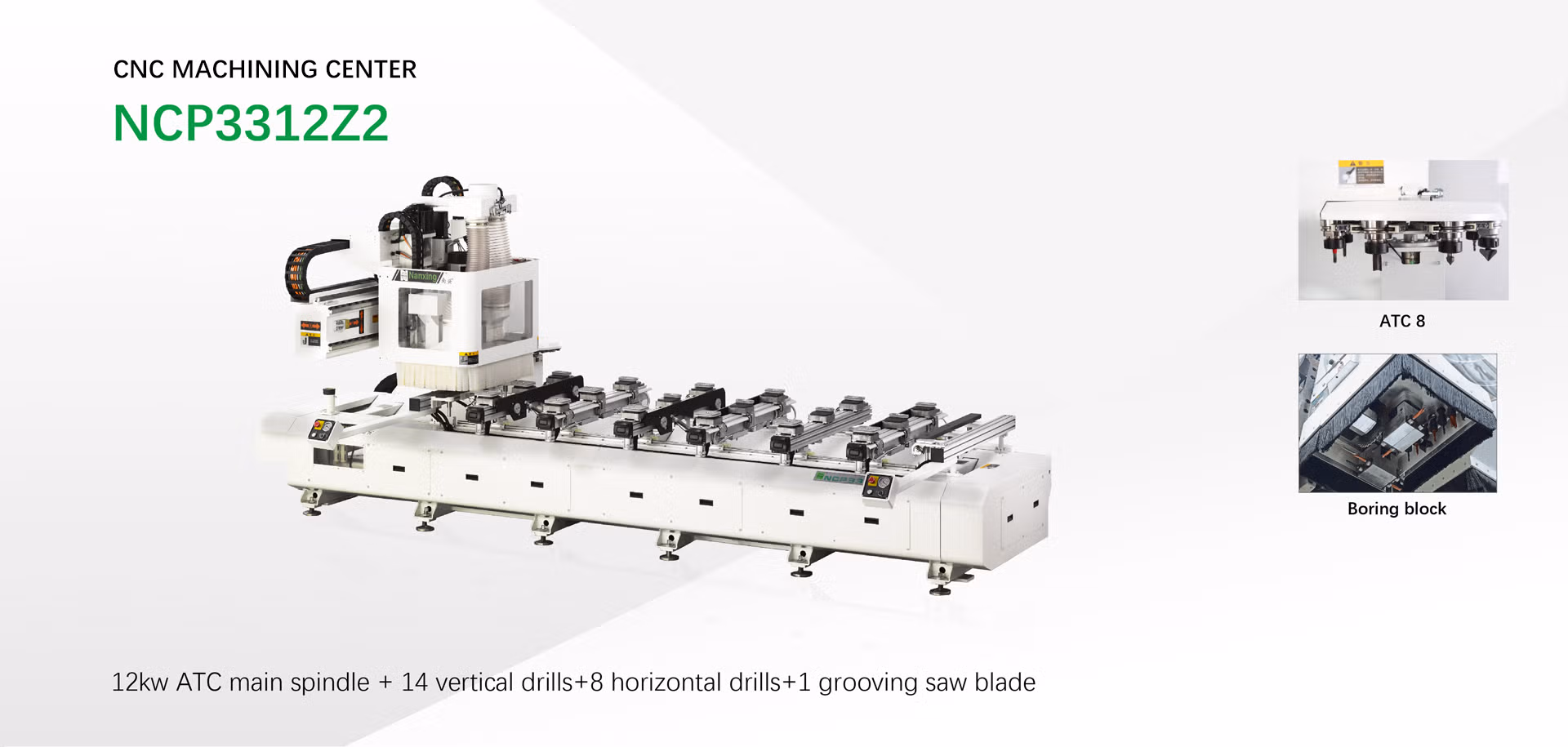 CNC with pod and rail table NCP3312Z2 is one of the machines must be used for the customized orders by furniture companies. This machine and the relevant furniture software can be linked without extra set up work, boring 5 sides and routing on top side in one process, also two working stations alternatively processing making production higher efficient. Moving axis X, Y, Z and change of tools are controlled by servo motors. Machine is designed with an open port to FCC software, easy to chase shapes of panels on drawing and their processing status, edit shapes, show data info of the order, and more functions.